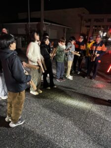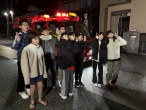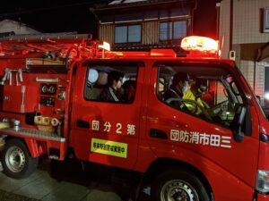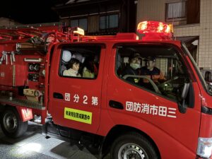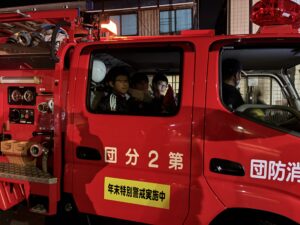 消防団の皆さんと消防車に乗せてもらい「火の用心」とマイクで声を出しながら地域を巡回したり、拍子木を打ち合わせながら歩いて地域を巡回する体験をさせていただきました。